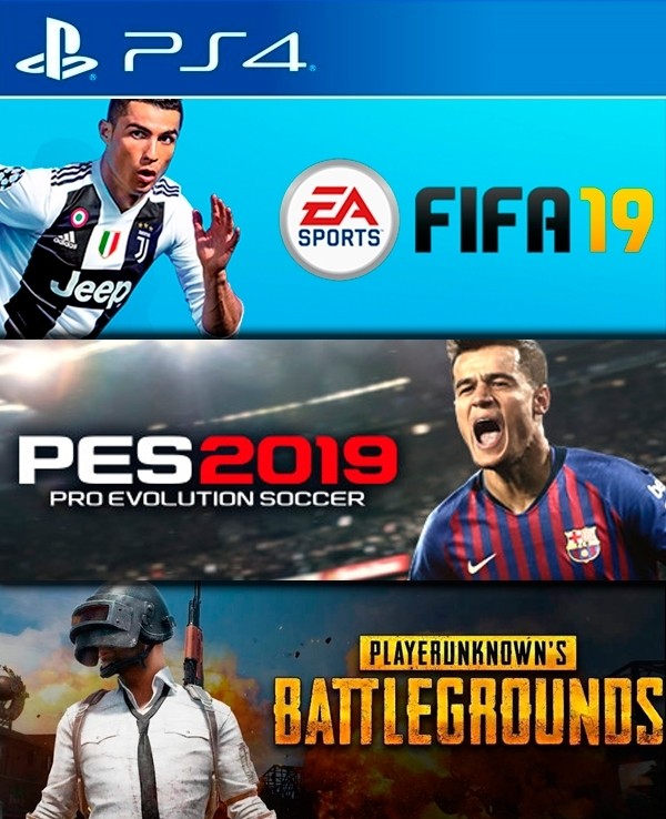 3 JUEGOS EN 1 FIFA 19 PS4 mas PRO EVOLUTION SOCCER 2019 PS4 mas PLAYERUNKNOWNS BATTLEGROUNDS PS4