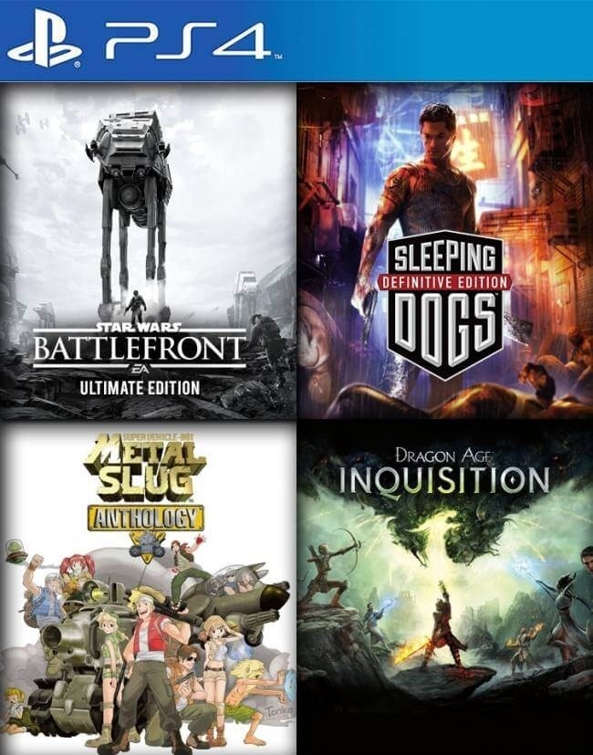 4 JUEGOS EN 1 EDICIÓN ULTIMATE DE STAR WARS BATTLEFRONT MAS SLEEPING DOGS DEFINITIVE EDITION MAS METAL SLUG ANTHOLOGY MAS DRAGON AGE INQUISITION PS4