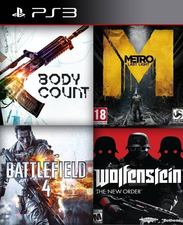 4 juegos en 1 en Español Bodycount mas Metro: Last Light mas Battlefield 4 mas Wolfenstein: The New Order ps3