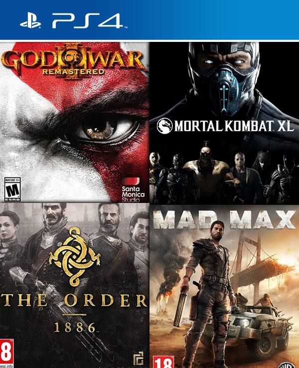 4 JUEGOS EN 1 Mortal Kombat XL MAS God of War III Remastered MAS Mad Max MAS The Order 1886 PS4